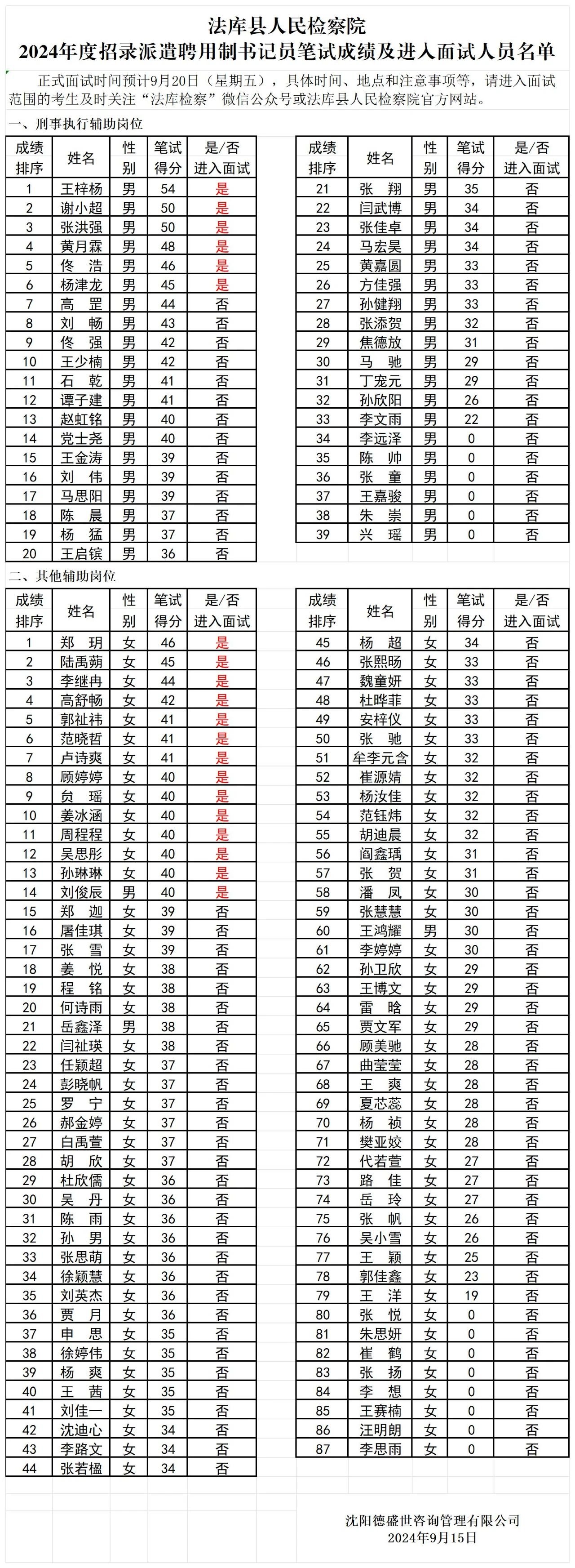 法库县检察院招录派遣聘用制书记员笔试成绩及进入面试人员名单