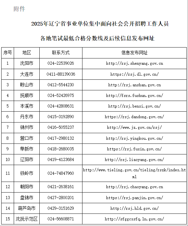 附件:2025年辽宁省事业单位集中面向社会公开招聘工作人员各地笔试最低合格分数线及后续信息发布网址