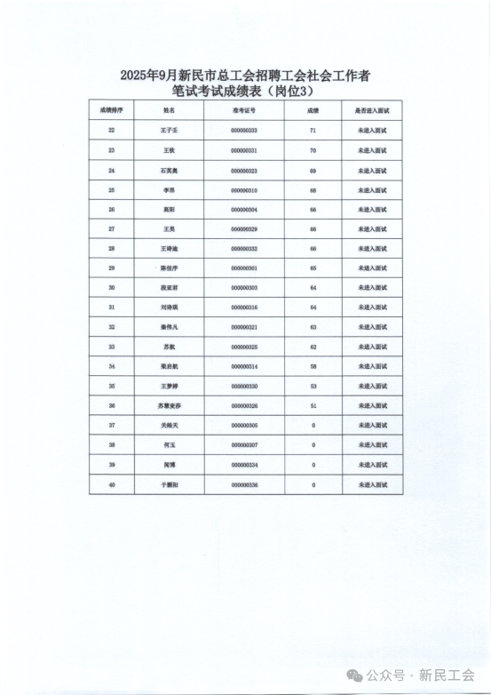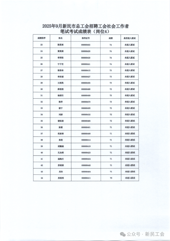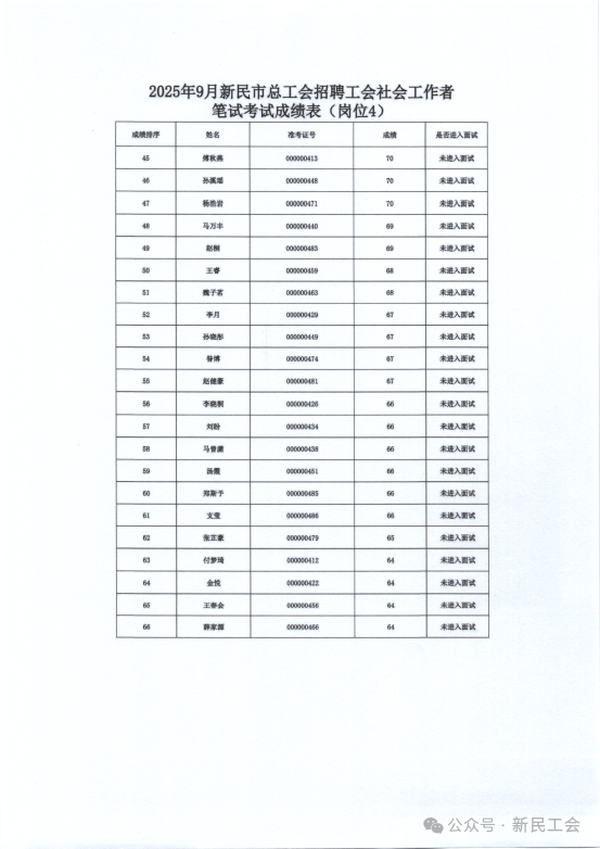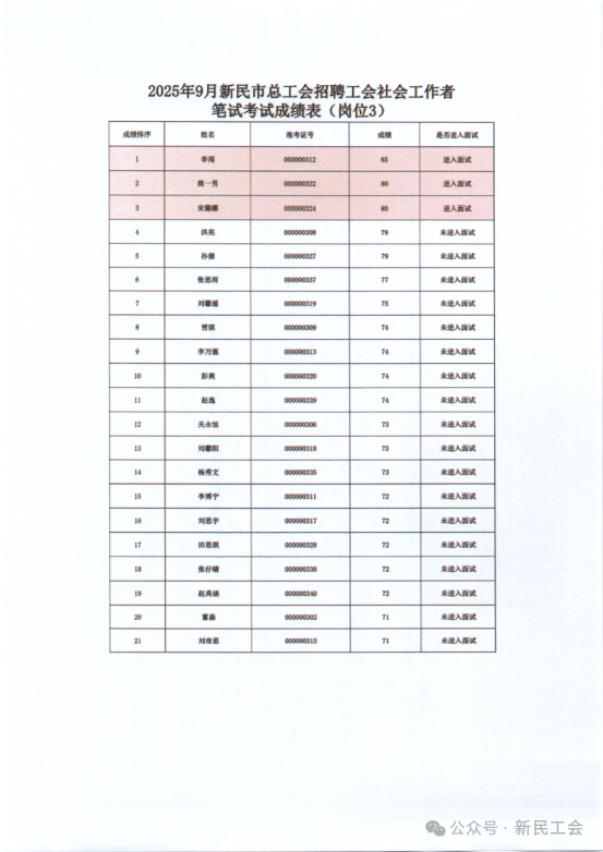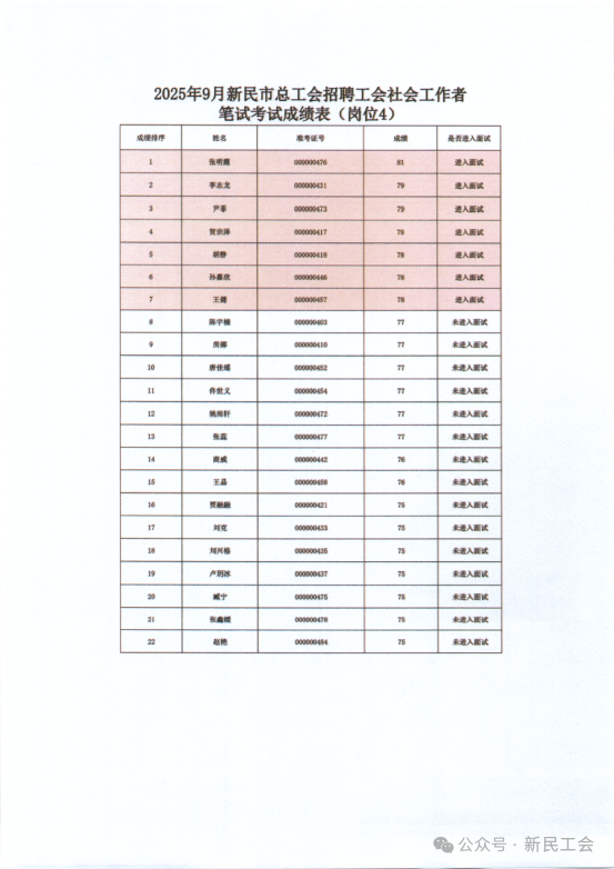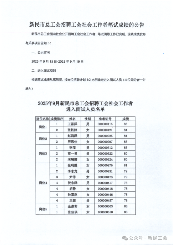沈阳新民市总工会招聘工会社会工作者笔试成绩的公告