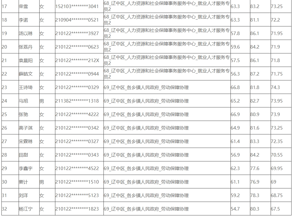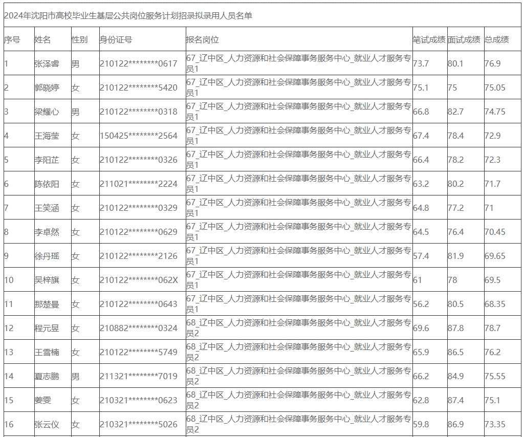 2024年沈阳市高校毕业生基层公共岗位服务计划招录拟录用人员名单