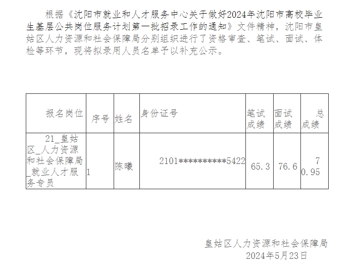 2024年沈阳市高校毕业生基层公共岗位服务计划(第一批)招录拟录用人员名单补充公示(皇姑区)