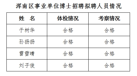 以上人员体检、考察合格予以公示,公示时间为7个工作日。公示期间对拟聘人员如有不同意见,请与沈阳市浑南区人力资源和社会保障局联系。