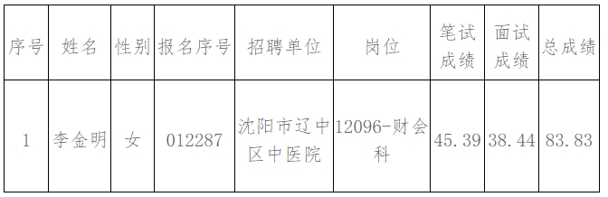 2023年沈阳市事业单位公开招聘因妊娠期留岗人员体检、考察工作已经结束。现将体检、考察合格拟聘用人员予以公示,公示期为七个工作日,公示期间对拟聘用人员如有疑义,请与沈阳市辽中区卫生健康局联系。