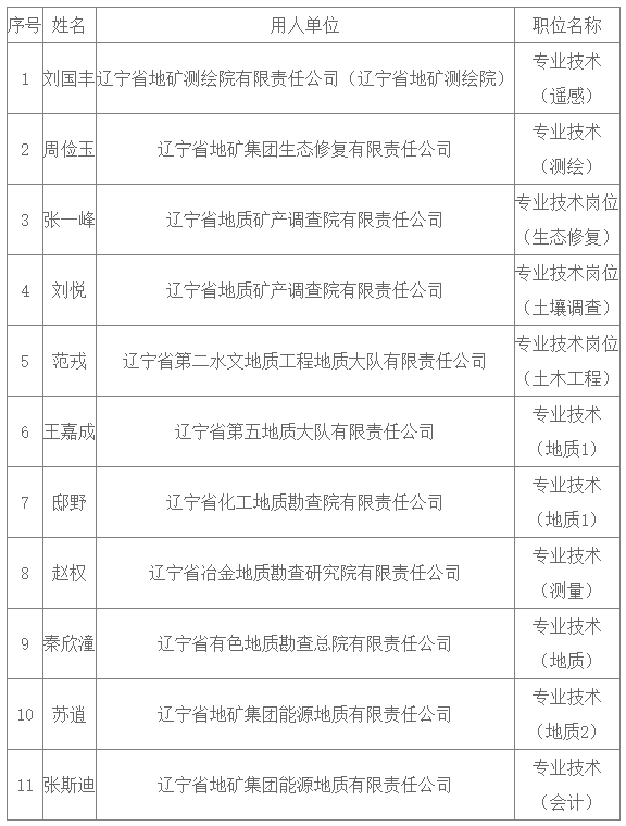 按照《辽宁省地质勘探矿业集团有限责任公司2024年上半年面向校园公开招聘公告》招聘工作的有关安排,经过面试、体检和考察等程序,确定以下11人为地矿集团拟录用人员,现予以公示。公示期间如有问题,请向辽宁省地质勘探矿业集团有限责任公司纪检监察部致电反映。