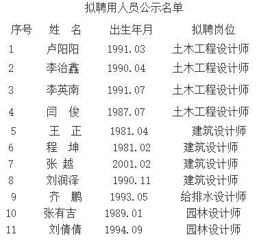 根据省属企业员工招聘有关规定,经过资格审查、笔试、面试、考察、体检等程序,确定以下人员为辽宁省市政工程设计研究院有限责任公司拟聘用人员,现予以公示。公示期间如有问题,请向辽宁省市政工程设计研究院有限责任公司综合办公室致电反映。