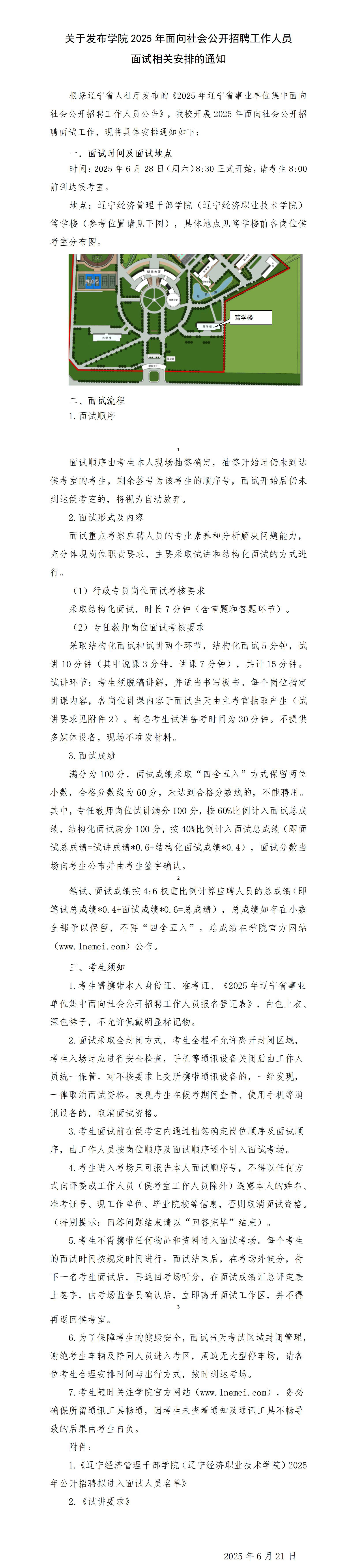 关于发布辽宁经济管理干部学院(辽宁经济职业技术学院)2025年面向社会公开招聘工作人员面试相关安排的通知