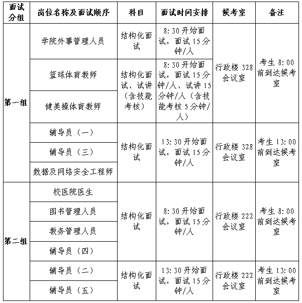 面试满分为100分,面试总成绩采取“四舍五入”方式保留两位小数,合格分数线为60分,未达到合格分数线的,不能聘用。其中,篮球体育教师、健美操体育教师岗位的面试总成绩由试讲(含技能考核)和结构化面试成绩组成,其中,试讲(含技能考核)满分100分,按50%比例计入总成绩,结构化面试满分100分,按50%比例计入总成绩(即面试总成绩=试讲(含技能考核)成绩*0.5+结构化面试成绩*0.5)。
