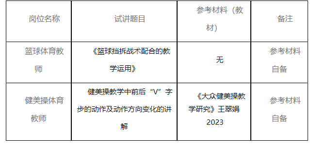 篮球体育教师和健美操体育教师岗位除结构化面试外,还需进行试讲(含技能考核),试讲人员请按照试讲题目及内容自行准备,现场不允许分发材料。试讲内容如下: