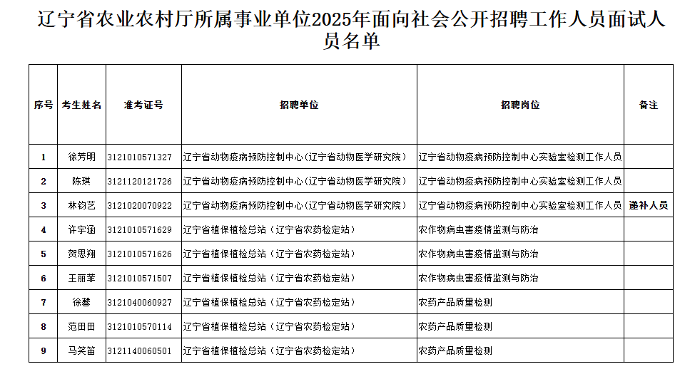 附件:辽宁省农业农村厅所属事业单位2025年面向社会公开招聘工作人员面试人员名单