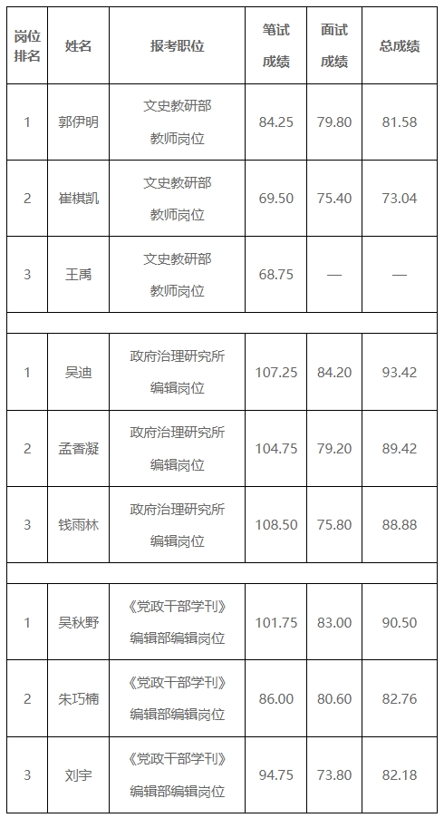 3.《党政干部学刊》编辑部编辑岗位:吴秋野(83.00)、朱巧楠(80.60)、刘宇(73.80)。