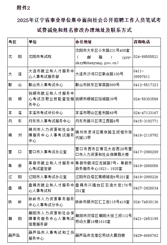 附件2:2025年辽宁省事业单位集中面向社会公开招聘工作人员笔试考试费减免和姓名修改办理地址及联系方式