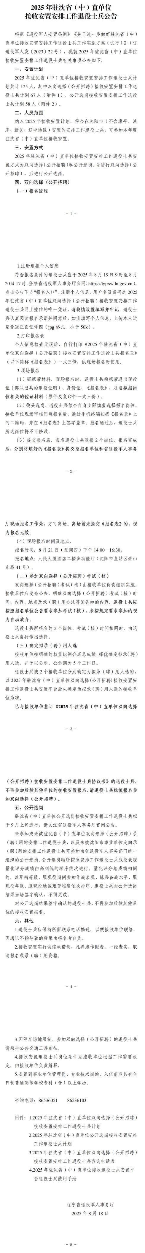 2025年驻沈省(中)直单位接收安置安排工作退役士兵125人公告