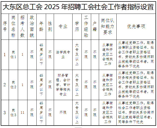 具体岗位数量、职责及任职条件详见《大东区总工会2025年招聘工会社会工作者指标设置》(附件)。