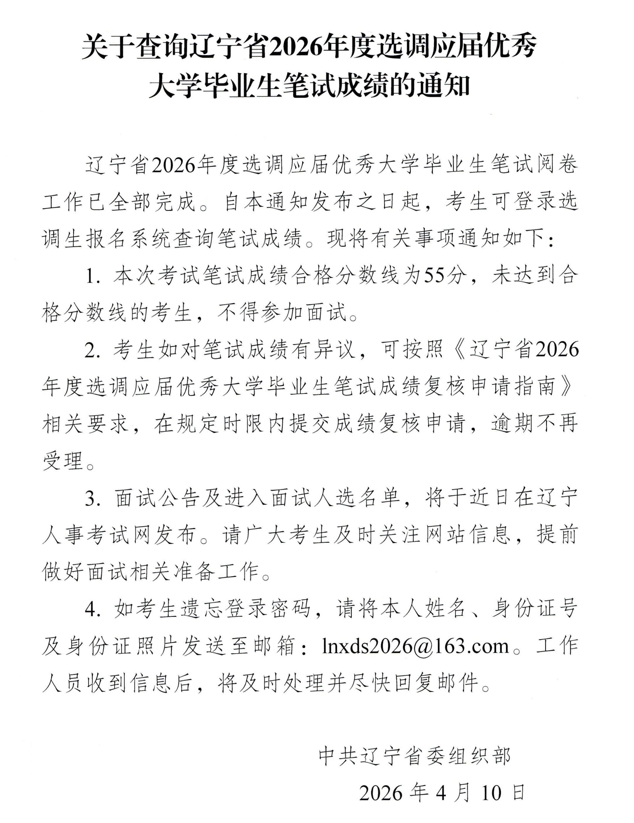 关于查询辽宁省2026年度选调应届优秀大学毕业生笔试成绩的通知