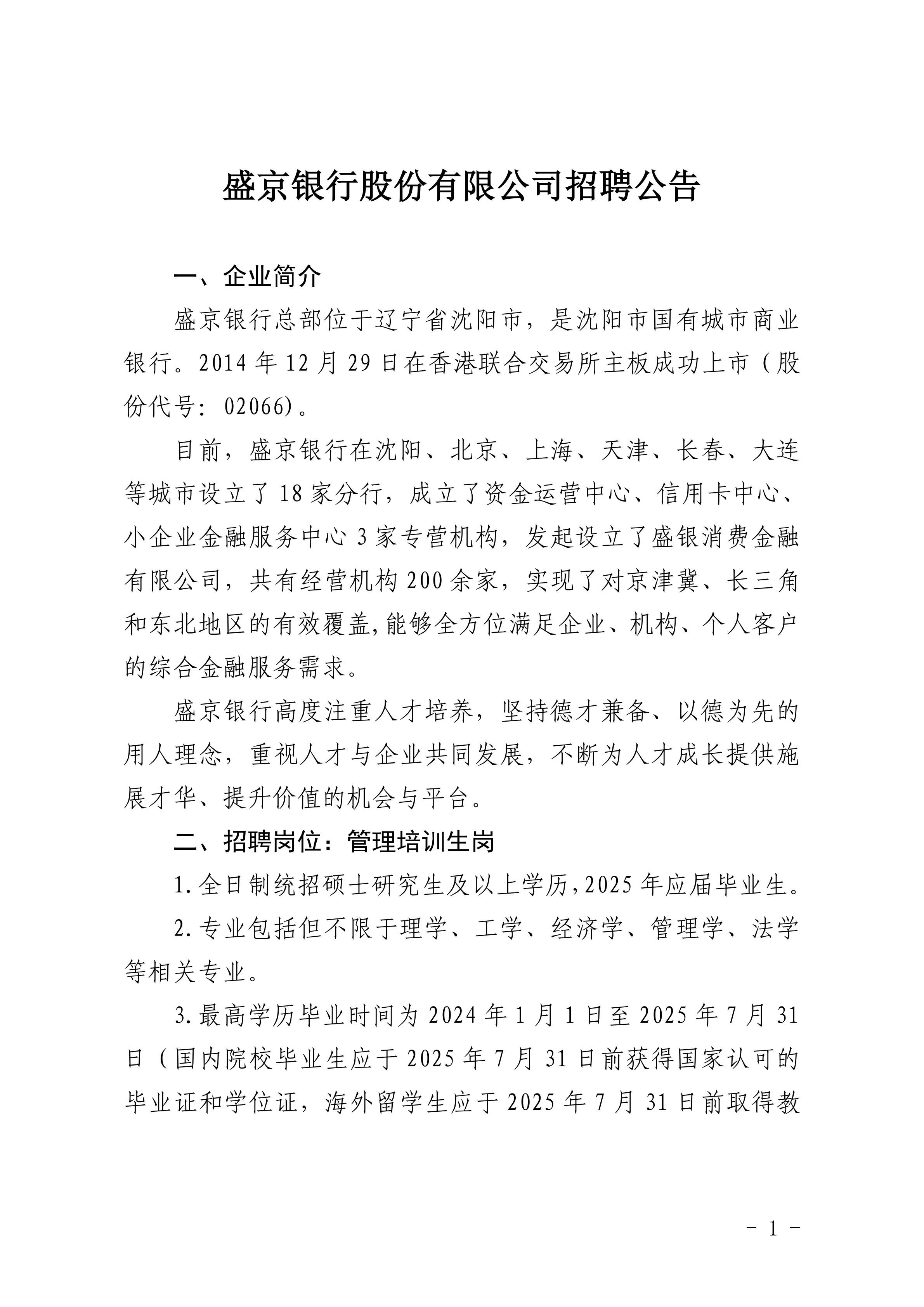 盛京银行股份有限公司2024年秋季校园招聘公告