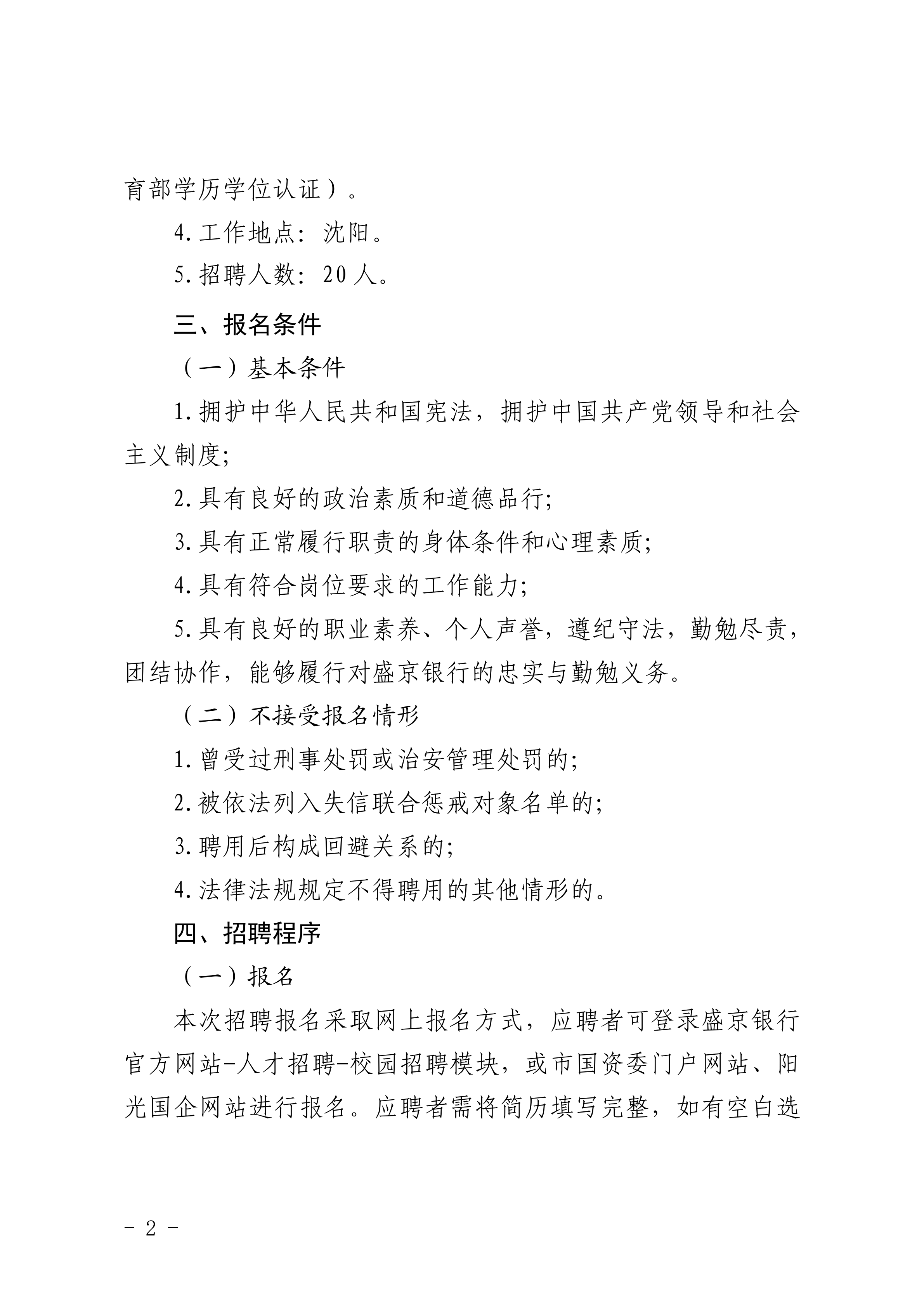 盛京银行股份有限公司招聘20人公告