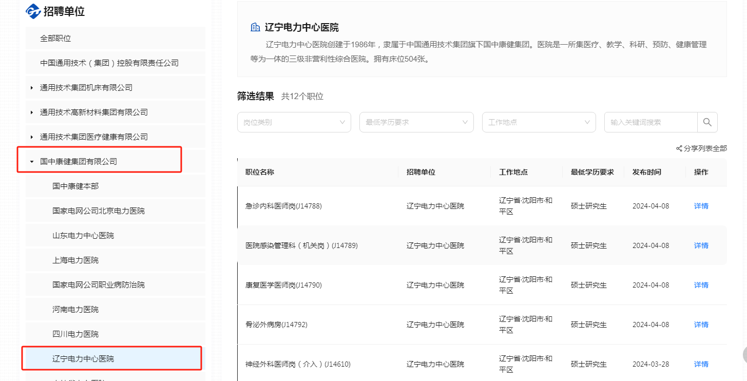 可根据工作地点、岗位名称进行岗位搜索,或在招聘单位中:找到国中康健集团有限公司-辽宁电力中心医院,并选择相应岗位进行报名。