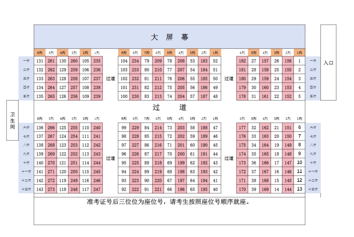 3.因本次考生人数较多,请各位考生提前参看考场座位图(附件1:第一考场;附件2:第二考场),以便进入考场后迅速找到座位,座位号为准考证后三位。