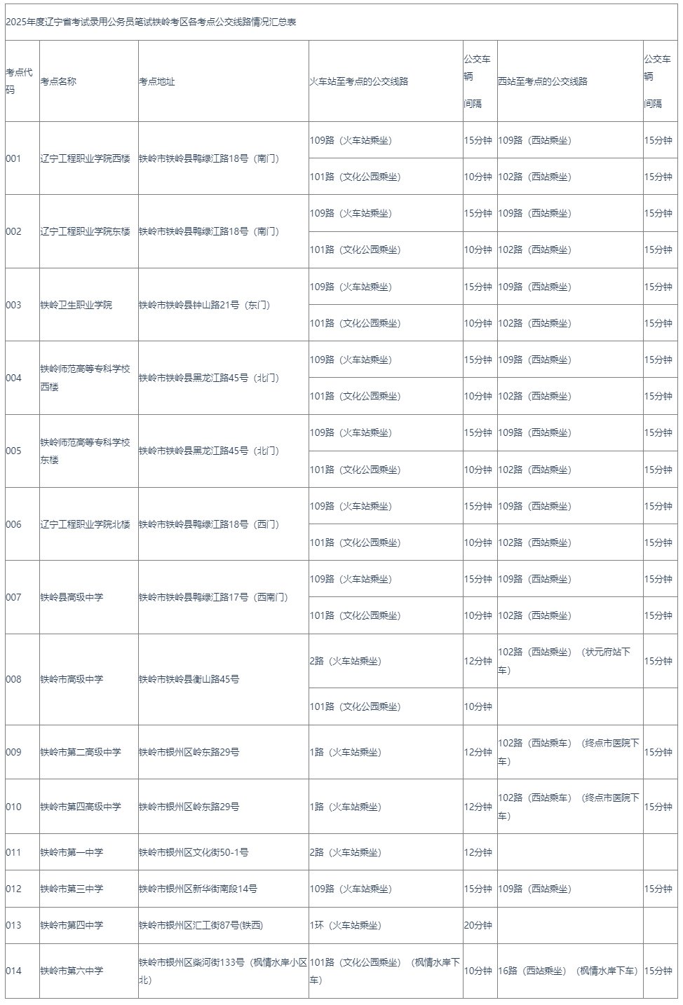 一、铁岭市公交线路102路(铁岭西站—考点—银州区)和109路(铁岭火车站—考点—铁岭西站)途径辽宁工程职业学院、铁岭师范高等专科学校、铁岭卫生职业学院、铁岭市高级中学、铁岭县高级中学考点。开考前两小时,公汽公司将对线路车辆实施班次加密举措,确保有充足的运力满足应试人员交通需求。