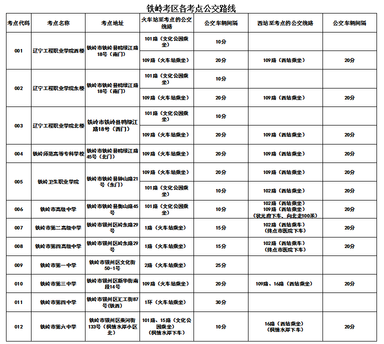 ※本次考试铁岭考区共设置12个考点,为防止走错,请应试人员注意区分以下考点名称:“辽宁工程职业学院西楼”“辽宁工程职业学院东楼”“辽宁工程职业学院北楼”;“铁岭市第四高级中学”“铁岭市第四中学”。