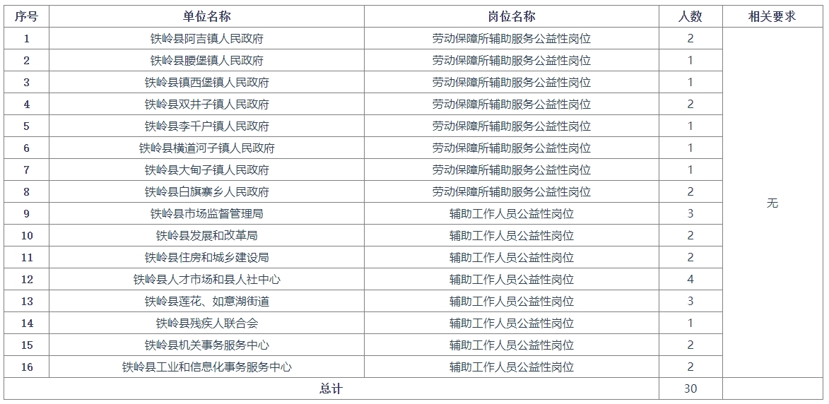 根据工作需要,铁岭县16家单位补充招聘公益性岗位工作人员30人,现具体公告如下: