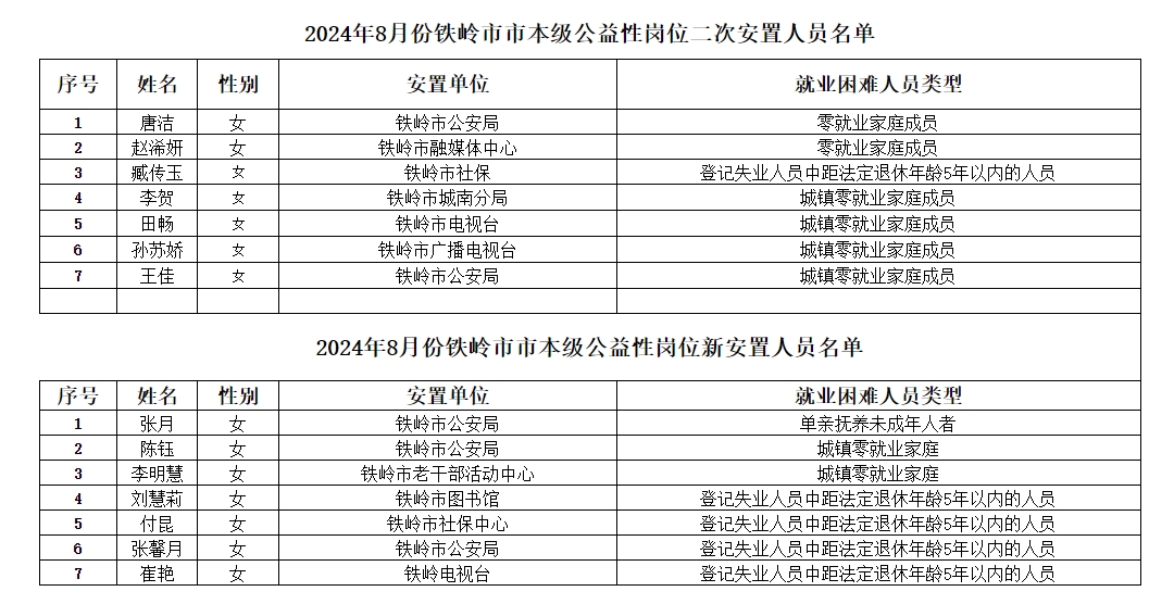 2024年8月份铁岭市市本级公益性岗位二次安置、新安置人员名单
