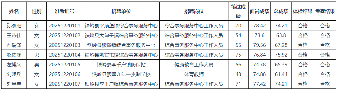 2025年铁岭县基层事业单位面向“三支一扶”大学生专项招聘拟聘用人员名单
