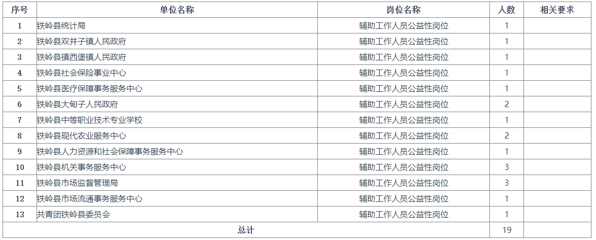 根据工作需要,铁岭县13家单位招聘公益性岗位工作人员19人,现具体公告如下: