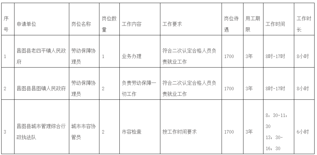 因工作需要,部分机关事业单位因原有公岗人员退休、离岗,已无法满足正常开展各项工作的需要,为提高工作效率,确保各项工作顺利有效完成,经请示县人力资源和社会保障局研究决定,共有3家单位申请招聘劳动保障协理员、城市市容协管员等共5名公益性岗位人员。