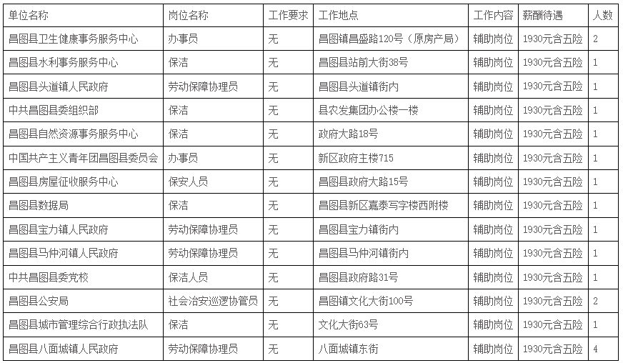 根据工作需要,昌图县14家单位补充招聘公益性岗位工作人员19人,现具体公告如下: