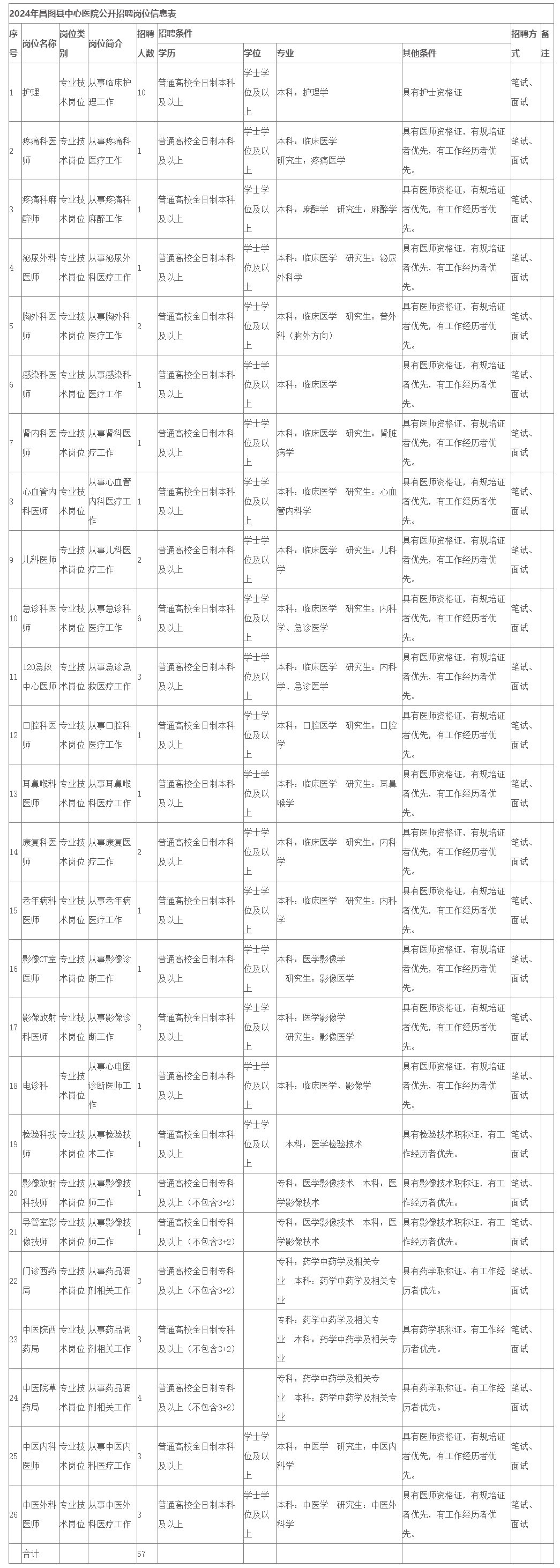 昌图县中心医院对2024年招聘各专业岗位将随时依法依规组织笔试、面试进行招录,录满为止。
