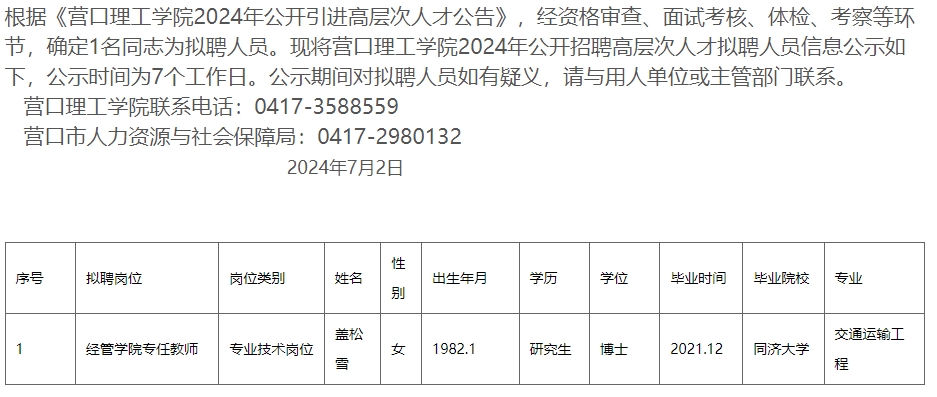 营口理工学院2024年公开招聘高层次人才拟聘人员公示(二)
