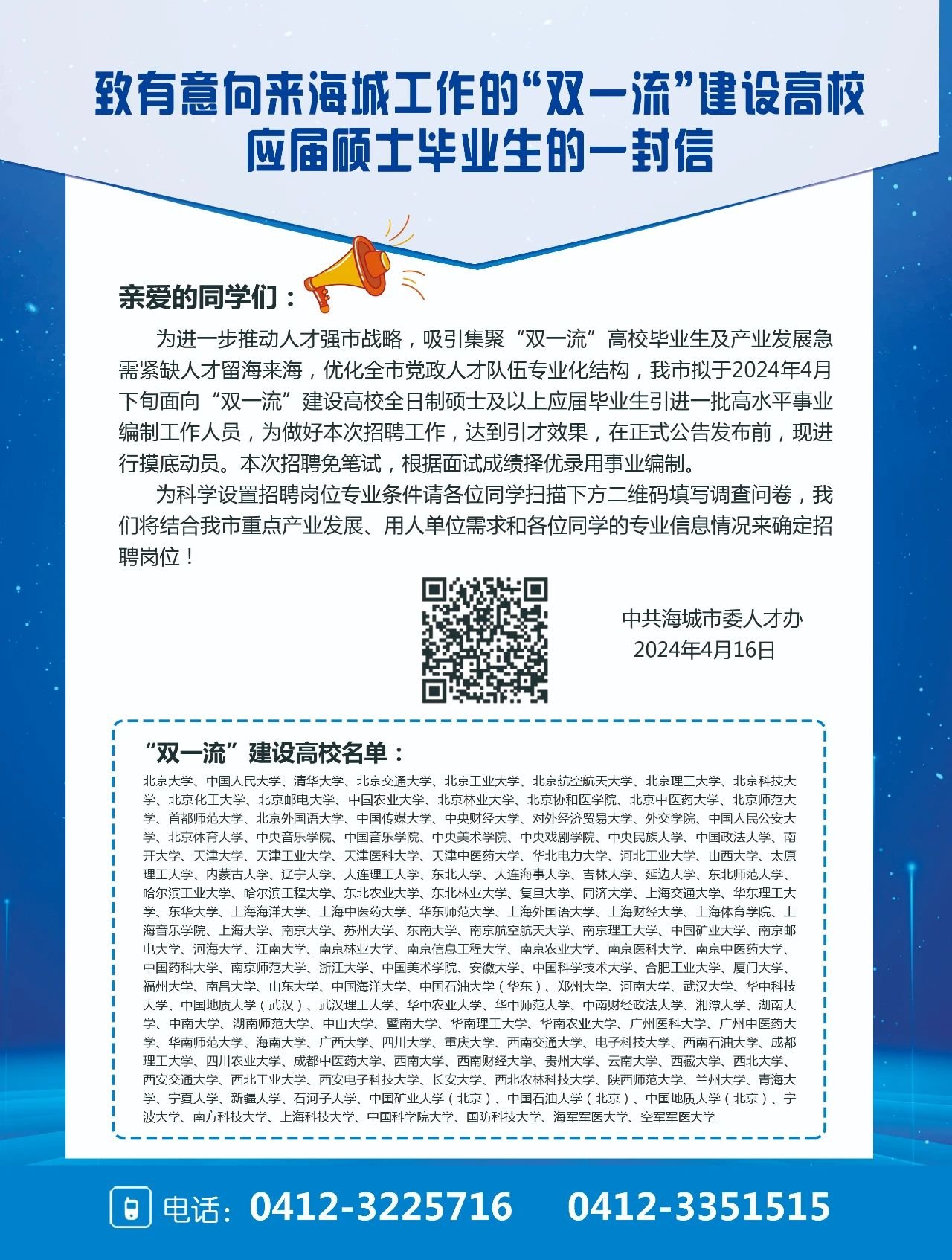 致有意向来海城工作的“双一流”建设高校应届硕士毕业生的一封信