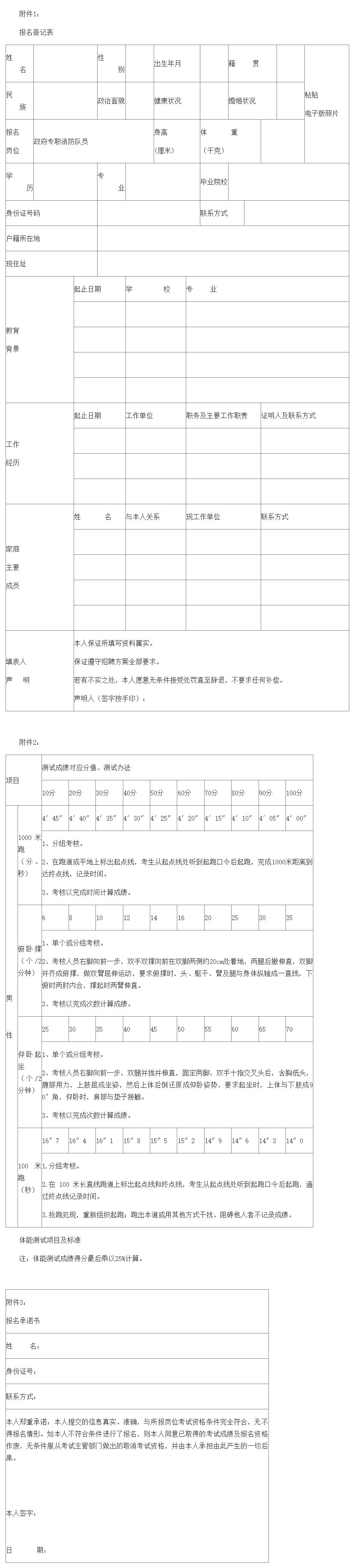 1.体能测试:现场组织考核,体能测评成绩现场公布。有一项不达标者,直接淘汰,不得进行下一科目考试。科目为1000米跑、俯卧撑、仰卧起坐、100米跑,单科满分100分,体能测试总分为四个科目的平均分。其中,报名消防车驾驶员的还需现场对驾驶技能进行测试,具体科目为:倒桩移库、坡道定点停车及起步、单边桥、侧方位停车、通过连续障碍、路面驾驶。(体测标准见附件2)