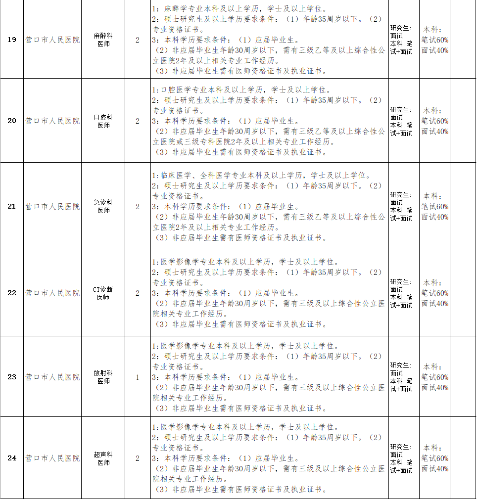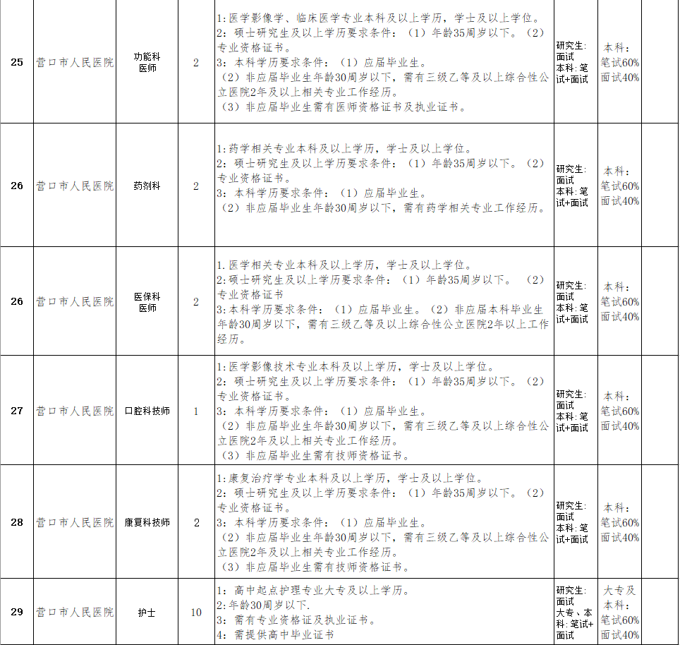 本科非应届毕业生:本人身份证、毕业证(护理专业需提供高中毕业证)、学位证、医师执业证书、医师资格证书、专业技术资格证书原件及复印件各一份,国家教育部“学信网”中查询的《教育部学历证书电子注册备案表》、营口市人民医院公开招聘报名登记表(详见附件)等招聘岗位需要的相关材料。
